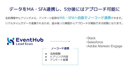 EventHubではSalesforce/HubSpotなどとのデータ連携を簡単に行えるため、事前の申し込みから参加の有無・視聴時間の管理などの一元管理が可能です。これによりデータの突合時間が大幅に削減され、本来やるべき「参加者データやROIの分析」に時間を割くことが可能になります。