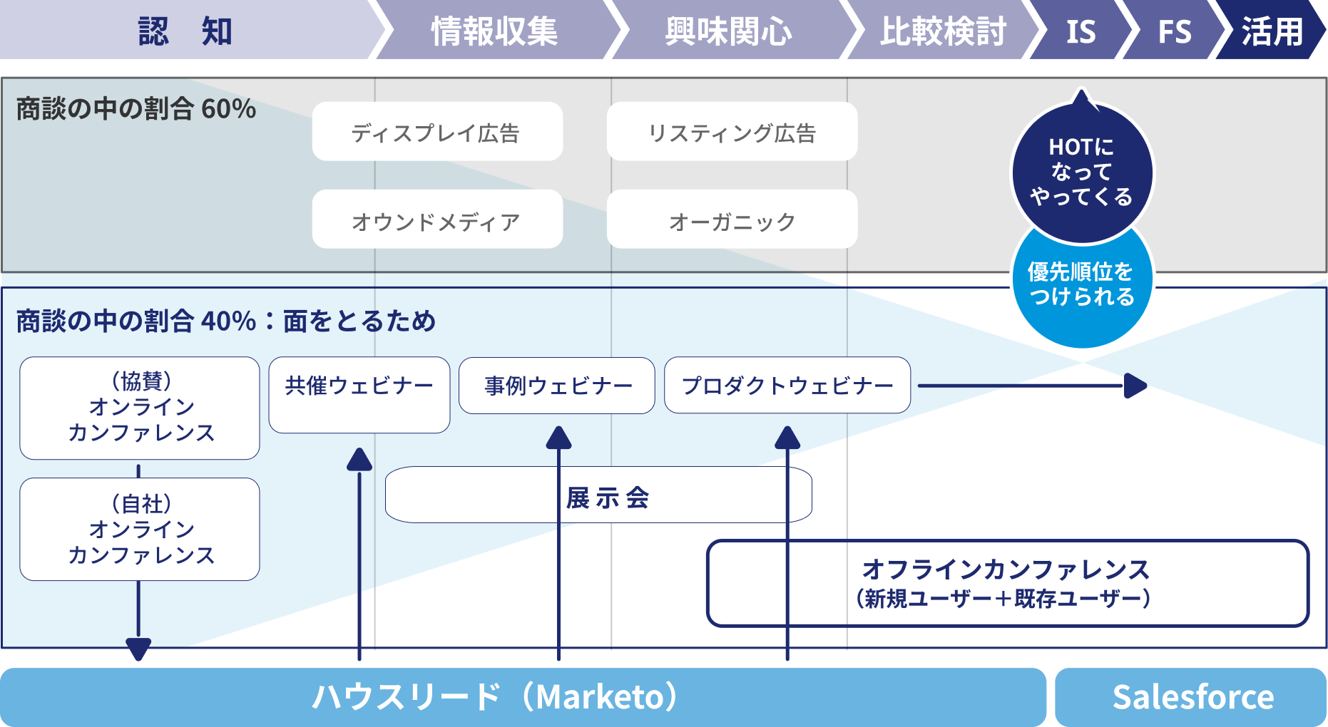 それぞれで獲得したリードをしっかりと商談に繋げるために、インサイドセールスアプローチは随時行っています。しかし、最初に得られた情報だけではまだアプローチが難しいリードもいます。そこで、課題に合わせた事例ウェビナーやサービス紹介ウェビナーも開催し、HOTリードを把握して優先順位をつけてアプローチを行っています。