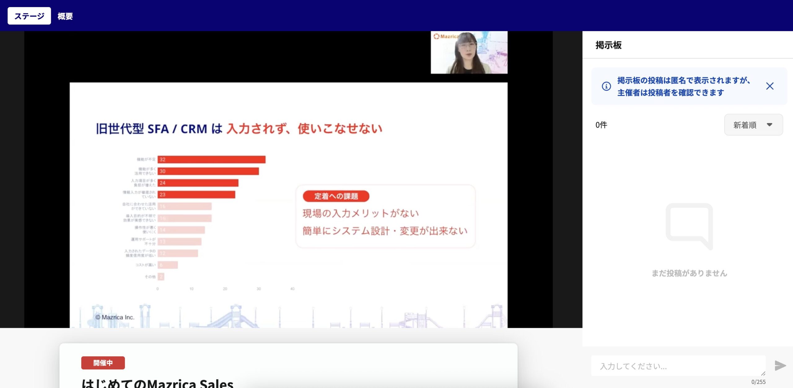 アンケート回答率も、以前より回答数が多いことがほとんどです 。視聴画面にポップアップで表示されたり、常に表示させておけたりする点が効果的だと思います 。また、ウェビナー終了後に未回答者の方にだけリマインドメールを自動で送っており、そこでの回答数の上積みもできています。