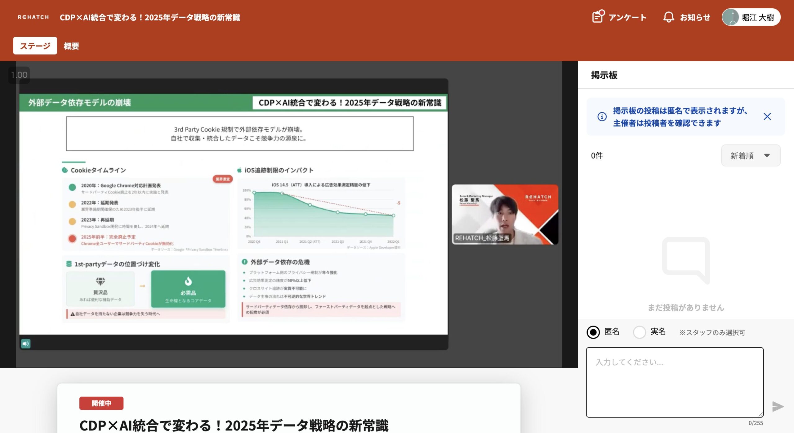 また、昨今のCookieデータが取得しにくくなる状況において、ウェビナーの参加申し込みやアンケート回答といった、自社で直接取得できるファーストパーティデータの価値はますます高まっています。これらの貴重なデータを最大限に活用し、今後さらに効果的なマーケティング活動を展開していく所存です。